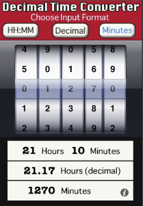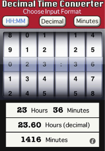Input values can be entered as hours:minutes, decimals, or just minutes, by selecting the input mode at the top of the screen. All conversions are displayed instantly in the lower half of the screen.